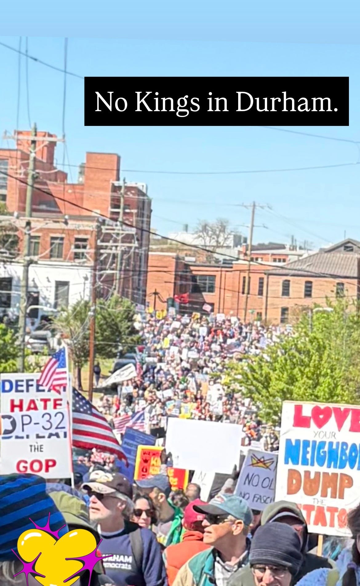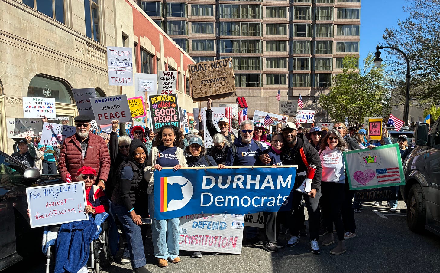 Thanks to all who showed up on Saturday and those who wished they could have. In these times, building coalition across a broad base is essential. We owe gratitude to the organizers, Democracy Out Loud! Bull City Indivisible, USSW, other unions, League of Women Voters, Stand up for Racial Justice (SURJ), Durham Democrats, and the Party for Socialism and Liberation. This is the broad coalition we must create to save our democracy from authoritarian takeover.