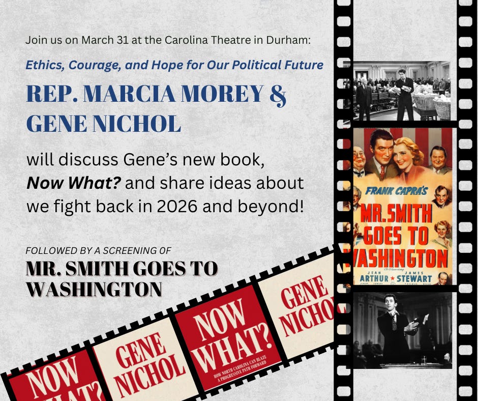 Join Rep. Marcia Morey and Gene Nichol at the Carolina Theatre in Durham on March 31 for a benefit to support The NC Progressive House Caucus PAC. Gene and Marcia will talk about his new book, “Now What?” and strategies for how we move forward with ethics, courage, and hope. The talk will be followed by a screening the film “Mr. Smith Goes to Washington.” You can get tickets online, or at the box office at the The Carolina Theatre of Durham. (please note: this is a benefit, tickets are $50.)