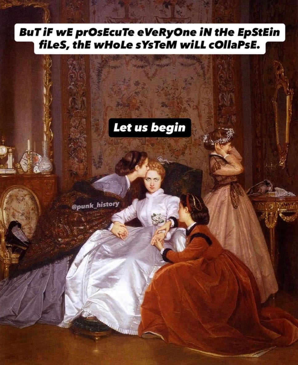 The Epstein class, many of whom are in or adjacent to this administration, rape and traffic children, jockeying for position in their lust for power over anyone and everyone, laughing and joking with each other as evidenced in the multitude of poorly spelled crude emails without any self awareness or disgust.